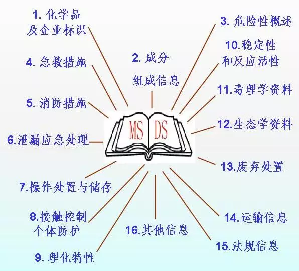 MSDS提供化学品的理化参数、燃爆性能、对健康的危害、安全使用贮存、泄漏处置、急救措施以及有关的法律法规等十六项内容。MSDS可由化学品生产厂家按照相关规则自行编写。